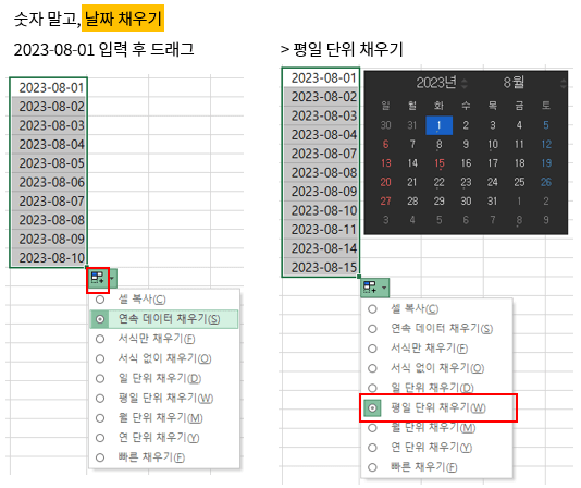 채우기 기능 중 가장 많이 사용한다. 숫자를 채우기 입력해야 하는 경우도 많지만 실무를 하다 보면 날짜를 채워야 하는 경우도 굉장히 많다. 특히 평일 기준으로 채워야 할 때가 많은데, 이럴 때 아주 유용하게 사용한다.