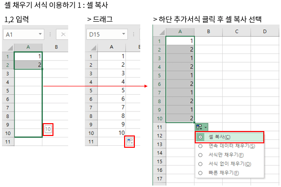 셀의 개수와 무관하게 셀 복사 기능으로 첫 번째 두 번째 예시의 값을 만들 수 있는 기능이다. 1,2 입력 후 셀복사를 누르면 1,2가 반복되고 1만 입력 후 셀복사를 누르면 자동으로 1만 채워진다.
