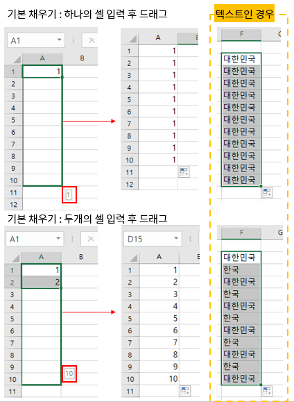 아래 사진 첫 번째 예시처럼, 하나의 셀만 입력 후 드래그하면 동일 값이 생성된다. 이는 텍스트도 동일하다.