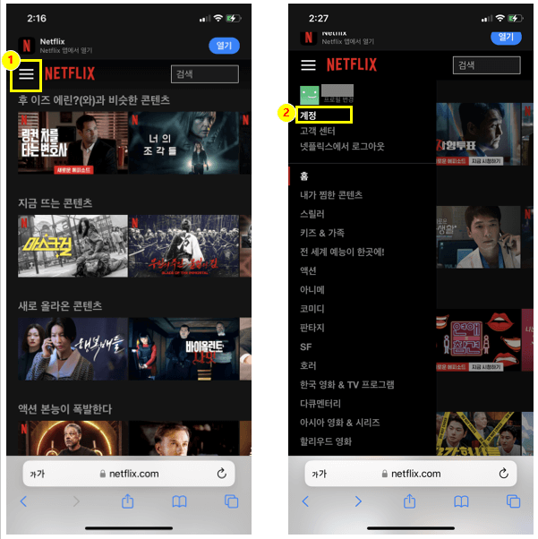 아까도 얘기했듯이 앱이 아닌, 사파리 크롬 등을 통해 netflix.com을 직접 입력해서 접속한다. 그리고 계정 로그인을 해준다. 로그인 후 위 사진과 같이 왼쪽 위 ≡ 이렇게 가로 세 줄 표시된 버튼을 누른다.(일명 햄버거 버튼)
