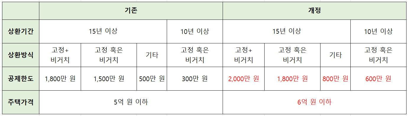 주택 담보대출이 있는 경우, 이자 지급분에 대해 소득공제되는데 이번 개정안에서 소득공제 한도가 확대되고, 대상이 되는 주택의 가격 조건을 상향 조정하여 적용받을 수 있는 대상 주택이 확대됐다.