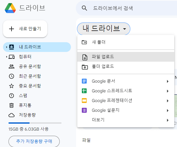 구글 로그인 > 구글 드라이브 접근 > 내 드라이브 > 파일 업로드 > 파일 선택 > 업로드 완료