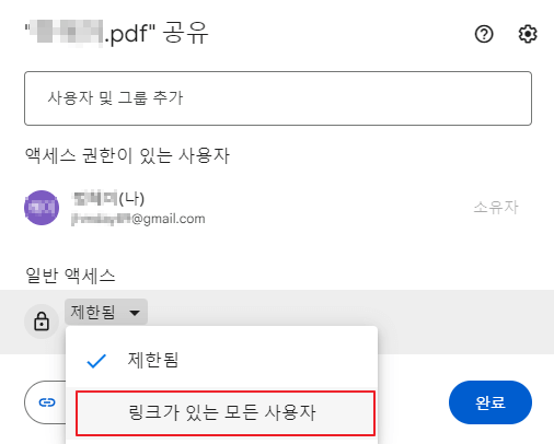 그럼 방금 업로드 해둔 파일에 접근할 수 있는 링크를 생성하는 화면이 나올 텐데, 링크를 생성하기 전 일반 액세스에서 링크가 있는 모든 사용자를 선택해 준다. 이렇게 링크가 있는 모든 사용자를 선택해야 내가 생성하는 URL 링크로 공유하려는 파일을 모두가 볼 수 있다.