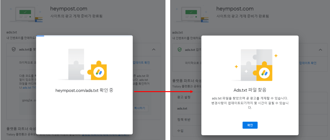 다행스럽게도, 확인 후 ads.txt 파일을 찾았다는 화면이 보였다. 다시 광고 게재가 가능하다는 희망적인 소식이다. 다시 메인으로 빠졌을 때도, 똑같이 경고 창은 나와 있지만, 지금 해결하기를 통해 다시 ads.txt 상태를 보면 아까 빨갛게 표시된 찾을 수 없음에서 초록색 승인됨으로 변경되어 있음을 확인할 수 있다.