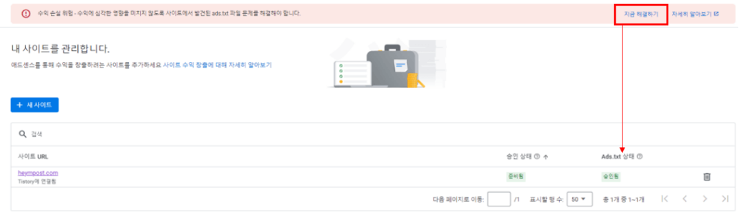 수익 손실 위험 - 수익에 심각한 영향을 미치지 않도록 사이트에서 발견된 ads.txt 파일 문제를 해결해야 합니다.라는 경고 창이 나와 지금 해결하기를 들어가 보니, 내 사이트 URL에 Ads.txt 상태에 찾을 수 없음이라고 빨갛게 표시되어 있었다.