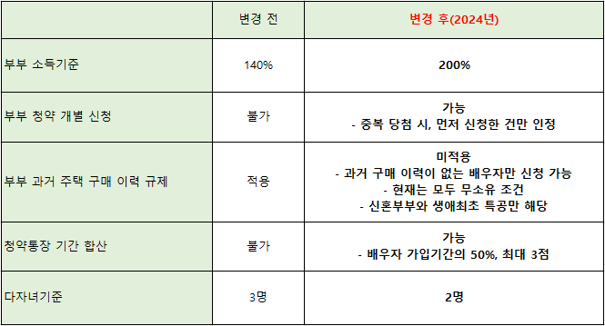 변경되기 이전에는 부부인 경우 둘 중 한 명만 청약을 신청해야 했고 각자 신청했을 때 둘 다 당첨되면 둘 다 무효 처리가 되는 어이없는 규정이 있었다. 하지만 다행스럽게도 변경 이후 각자 신청이 가능하며, 둘 다 당첨되는 경우 둘 중 먼저 신청한 사람이 자격을 갖게 된다.
