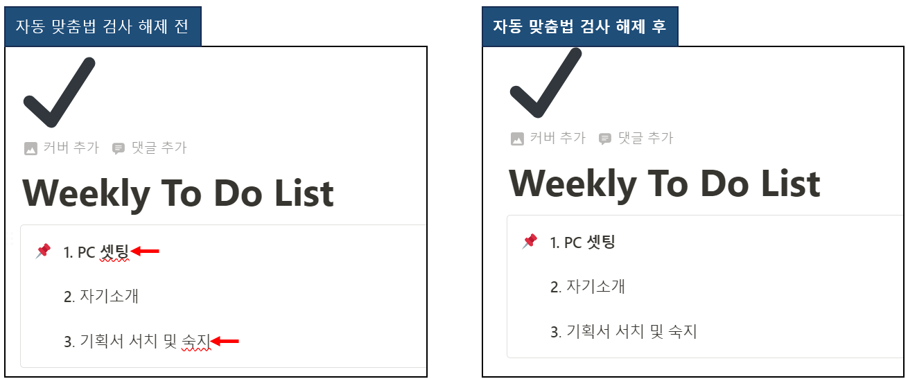 위 왼쪽 사진은 자동 맞춤법 검사 해제 전이고 오른쪽은 해제 후 사진이다. 빨간색 화살표로 표시된 부분을 확인하면 일부 단어에 빨간색 물결 라인을 확인할 수 있다. 바로 자동 맞춤법 검사인데, PPT나 워드 문서 작업할 때도 익숙한 자동 맞춤법 검사 기능이다.