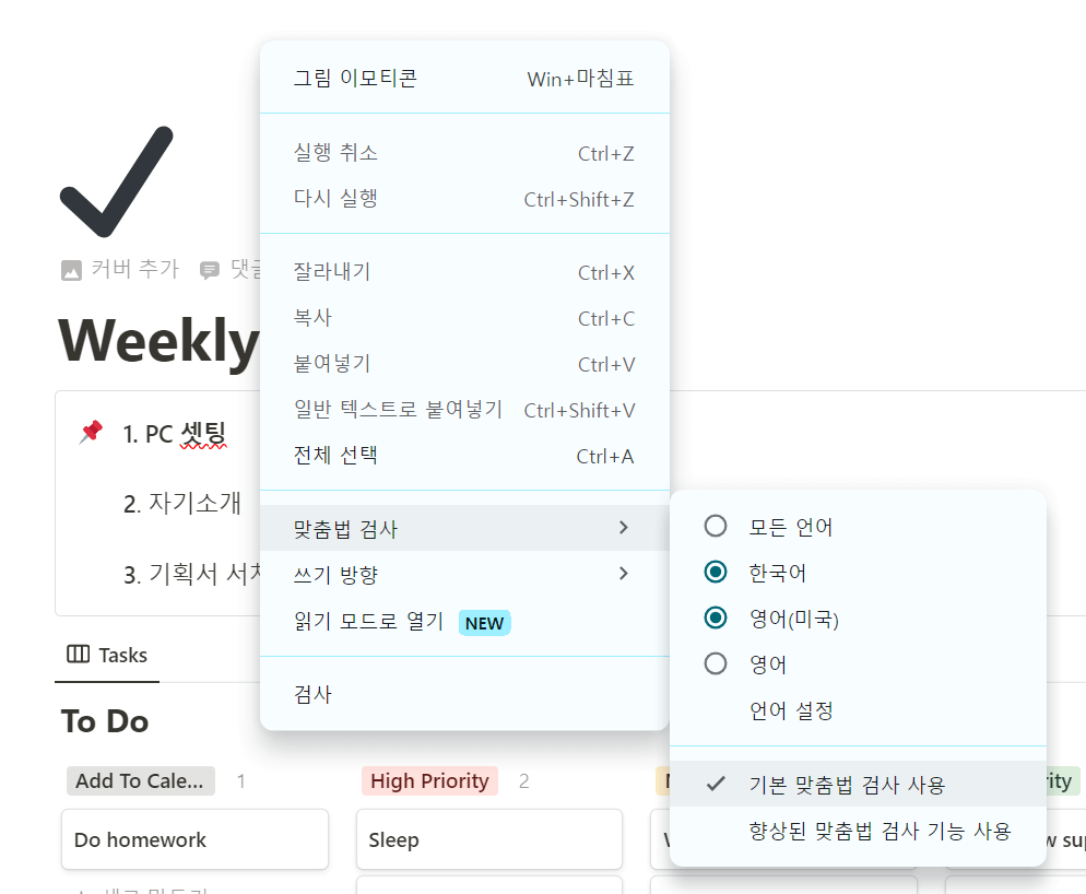 노션 빈공간 우클릭 > 맞춤법 검사 비활성화