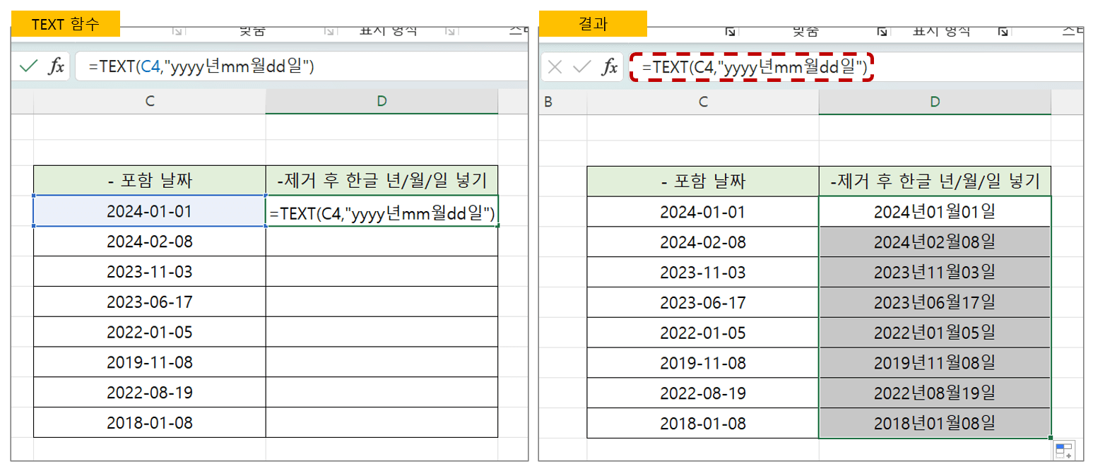 TEXT 함수를 사용하면 위 오른쪽 사진과 같이 -가 포함된 날짜에서 년월일 텍스트 형식으로 변경된 것을 확인할 수 있다.