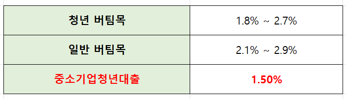 오늘 확인해 보니, 가능하다면 일반 버팀목 대신 청년 버팀목을 받는 게 더 유리한 것을 확실히 알 수 있다. 하지만 청년 버팀목 보다 대출이자 금리가 조금 더 유리한 상품으로 중소기업 청년대출이 있다. 중소기업에 근무한다면 청년 버팀목과 함께 중기청 대출을 알아보자.