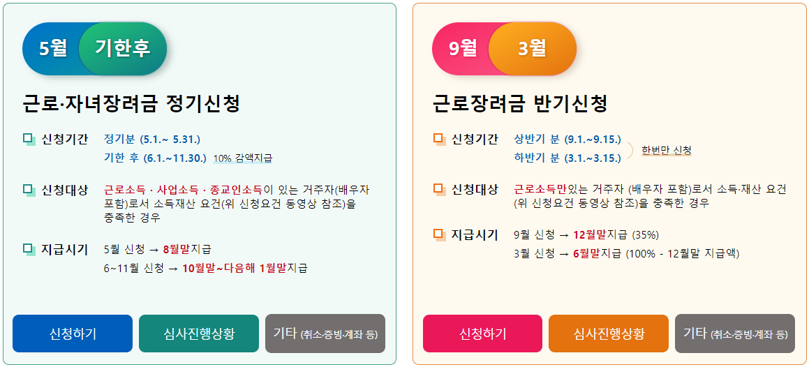 현재는 근로장려금 반기신청 22년도 하반기분만 가능하다. 아래 사진에서는 오른쪽에 해당한다.