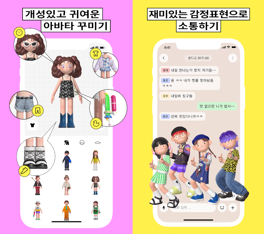 아바타를 사용해 친구, 지인 등 다른 사람과 메시지를 주고받을 수 있는 앱이다.