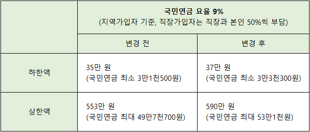 하한액 증가로 인해 37만 원 이하 소득자는 월 최대 1,800원만큼 국민연금이 증가하고 590만 원 이상 소득자는 월 최대 33,300원 증가한다.
