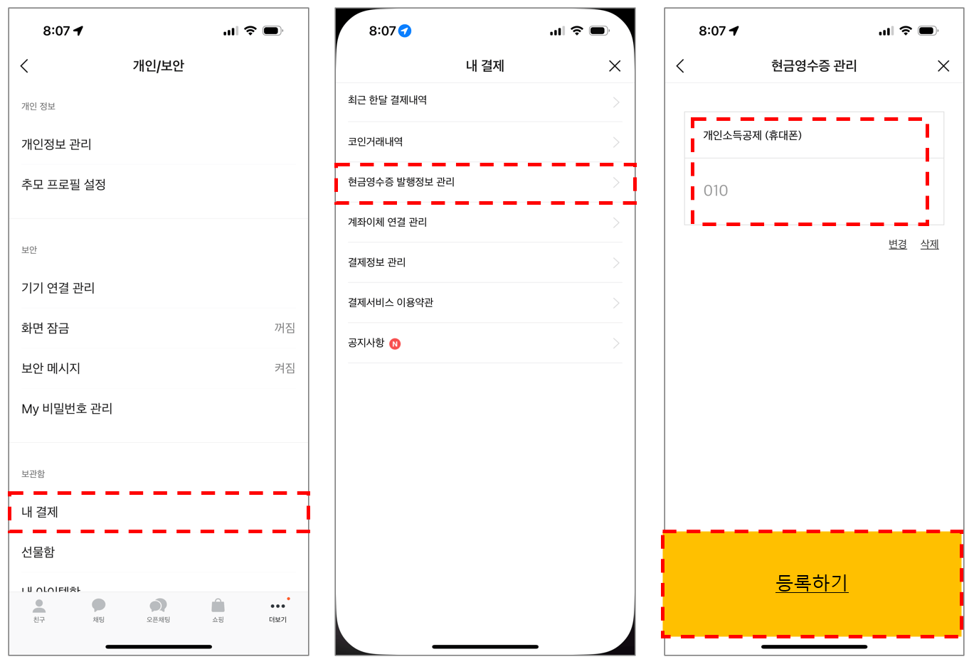 카카오톡 하단 탭바 오른쪽 끝 더 보기 > 오른쪽 위 톱니바퀴 > 개인/보안 > 내 결제 > 현금영수증 발행정보 관리 > 등록