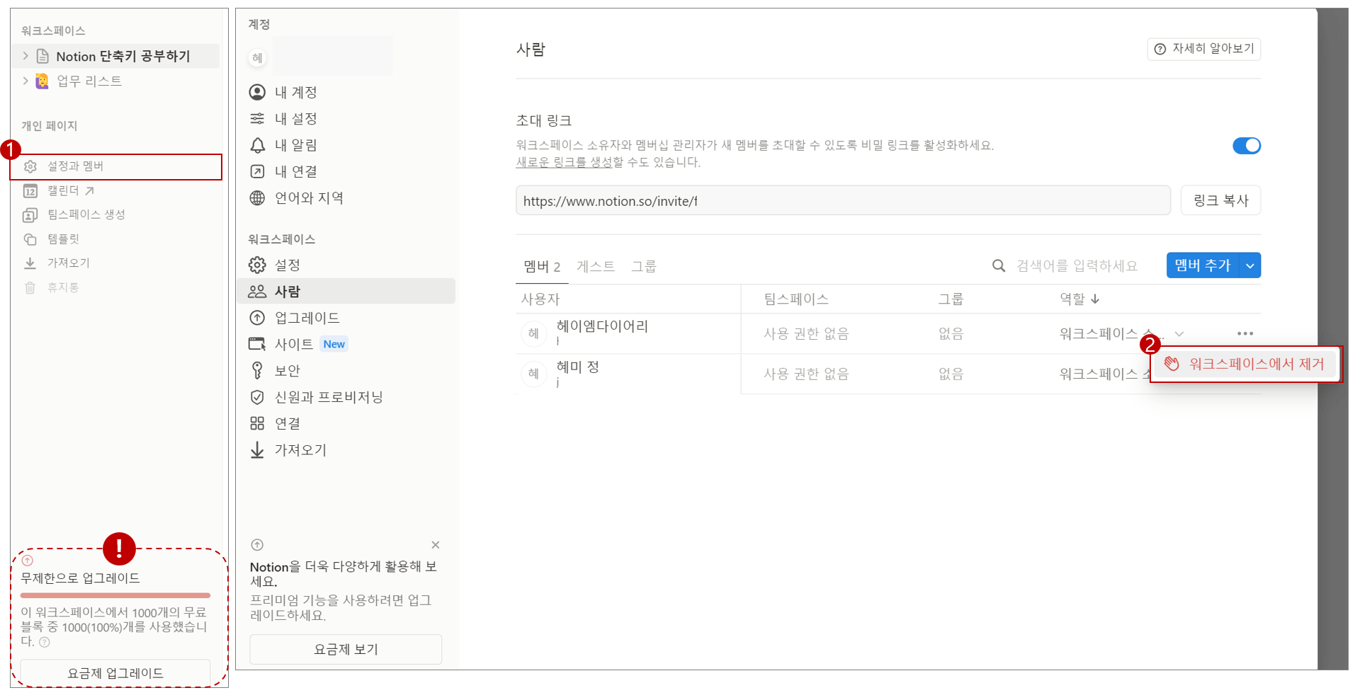 노션(Notion) 초보 : 1000개의 무료 블록 중 1000(100%)개를 사용했습니다. 해결 방법, 워크스페이스 멤버 삭제 방법