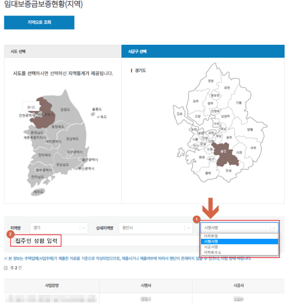 확인 경로 : 주택도시보증공사(HUG) 홈페이지 > 기업보증 > 임대보증금보증 > 임대보증금보증현황(지역) > 지역명 선택 > 상세지역명 선택 > 시행사명 선택 후 임대인 성함 입력하고 검색 클릭